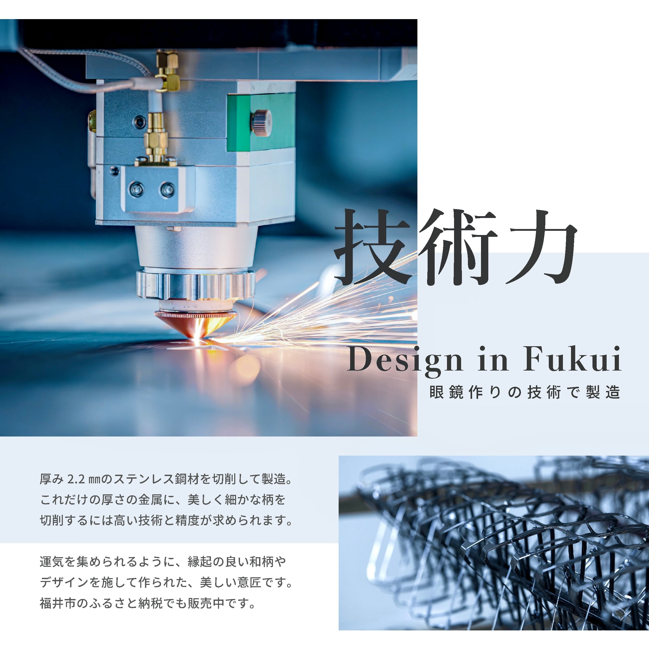 福井県鯖江のメガネ作りの高い技術を活かして、メタルに縁起が良い柄を切削しています。